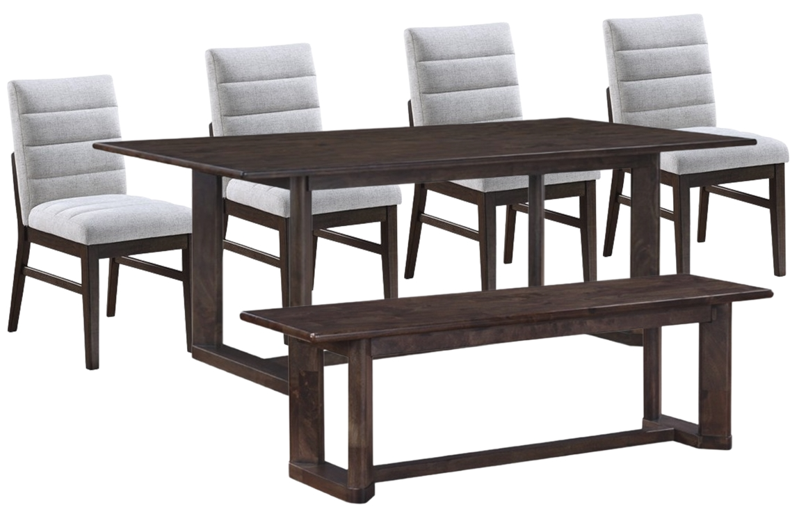 Includes one dining table, one dining bench, four side chair