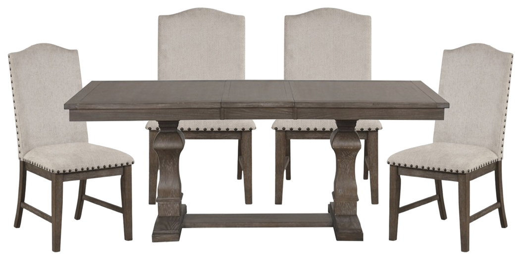 Victoria Oak features a distressed brushed gray finish, 18” extension leaf, and a bold double pedestal base for added stability and charm. The upholstered linen chairs with nailhead trim provide both comfort and character, making this dining set perfect for everyday meals or special gatherings with family and friends.Read More