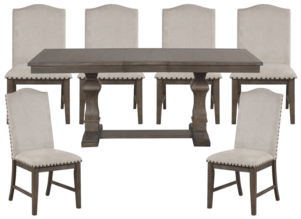 Victoria Oak features a distressed brushed gray finish, 18” extension leaf, and a bold double pedestal base for added stability and charm. The upholstered linen chairs with nailhead trim provide both comfort and character, making this dining set perfect for everyday meals or special gatherings with family and friends.Read More