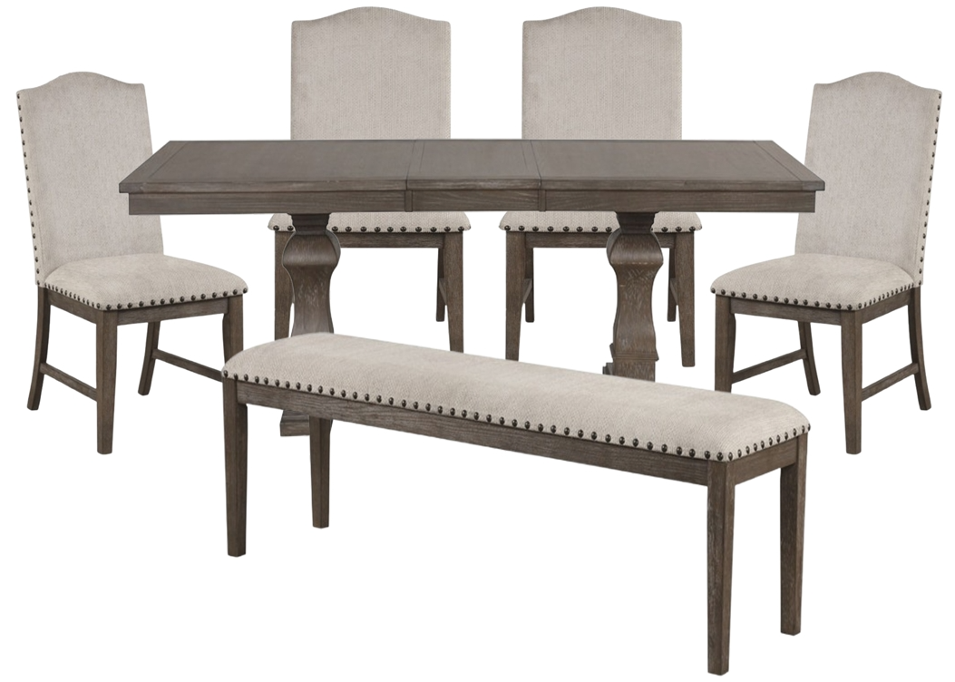 Victoria Oak features a distressed brushed gray finish, 18” extension leaf, and a bold double pedestal base for added stability and charm. The upholstered linen chairs with nailhead trim provide both comfort and character, making this dining set perfect for everyday meals or special gatherings with family and friends.Read More