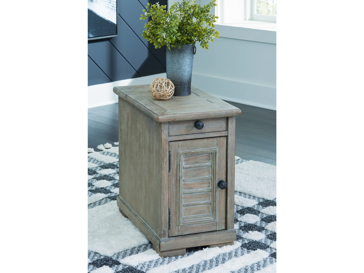 Description Lighten the look of your living space. The Moreshire chairside end table offers a casual traditional aesthetic, with natural wood undertones enhanced by a glazed bisque finish and wire-brushed texture. This end table puts it all within reach, with a storage cabinet and pull-out tray. Its built-in power supply and dual USB ports have your charging needs under control. Made with acacia wood solids and veneer with MDF substrate Lightly wire-brushed texture in a glazed bisque finish with natural wood undertones Storage cabinet and pull-out tray Cabinet door and drawer front with overlay moulding Louvered door panel 110V power supply with dual USB charging ports Power cord included; UL Listed Due to the use of natural materials, some variations may occurRead More