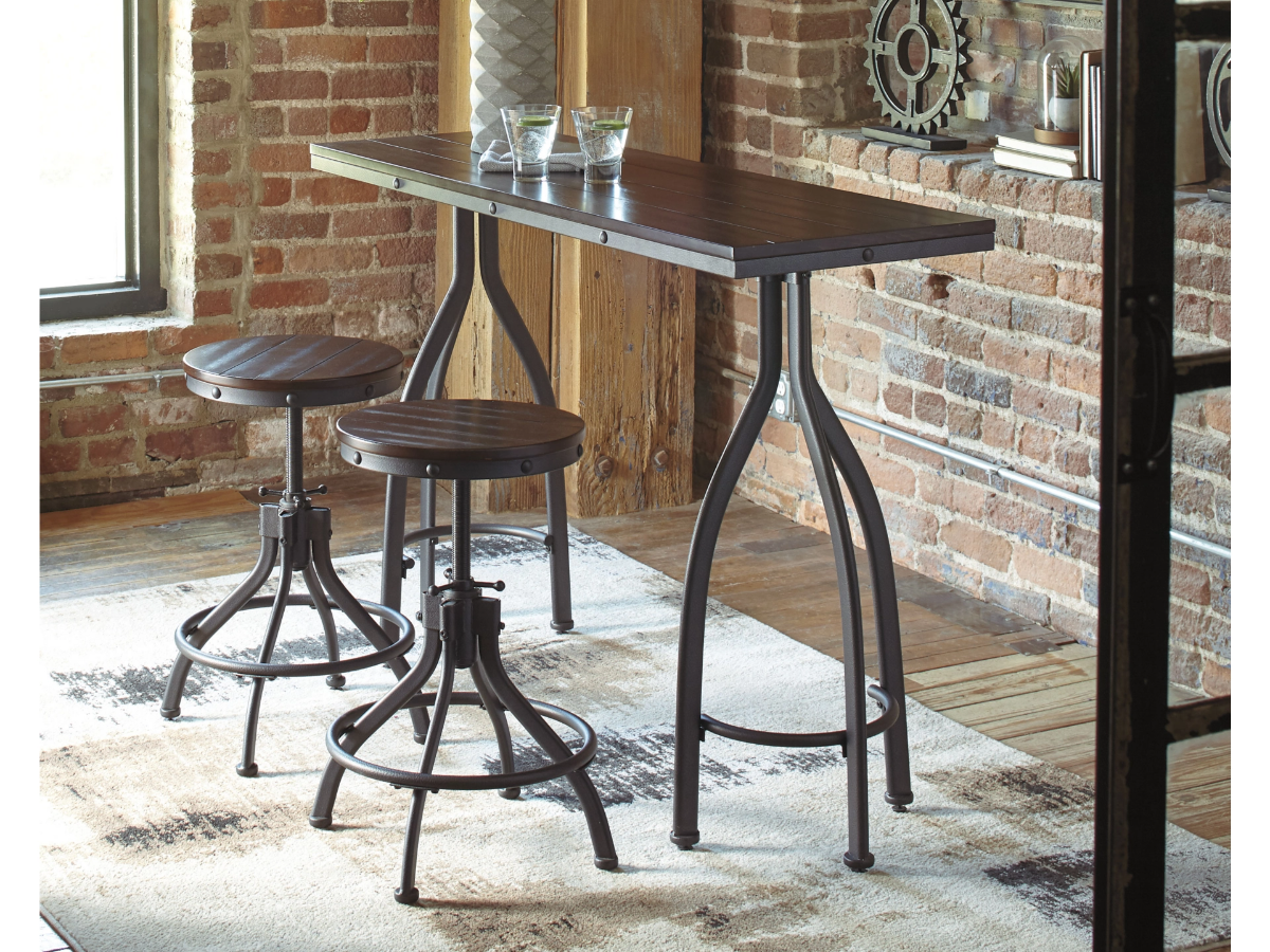 Description Take casual dining to new heights with the Odium counter height rectangular table and bar stools set. The table is scaled down to fit in the smallest of spaces—perfect anywhere, especially in a studio apartment or narrow kitchen nook. Admire how the dark bronze-tone powder coat metal finish, planked looking table top and swivel stools reflect the popular rustic, industrial style. Decorative details include metal rivets and curved metal design. The stools conveniently swivel and their heights are adjustable, perfect for flexibility. Includes slender table and 2 stools Made of metal, engineered wood and birch veneers Table and stool tops feature a planked effect Stools' heights are adjustable Stools swivel and have comfortable footrests Seats 2Read More
