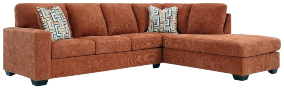 Liven up your living room with this sectional with chaise. Its trend-right burnt orange upholstery adds a playful pop of color to your decor. Bold and eclectic accent pillows complete the look. Pairing posh style with everyday comfort, the sectional is a welcome addition to contemporary spaces.Read More