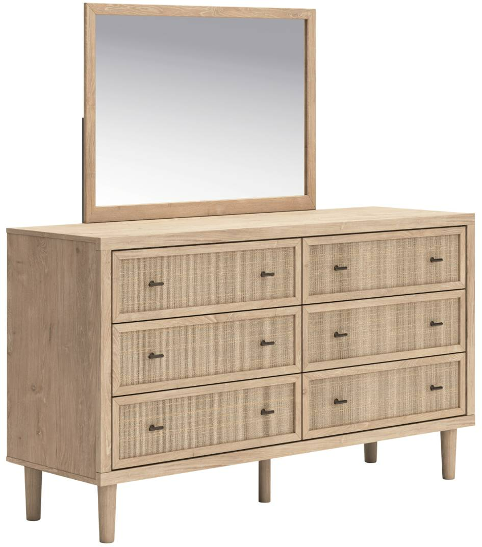 Clean-lined and contemporary—but far from stark—this dresser with mirror is a fresh style awakening. Pairing a light finish with replicated oak grain and textured beige details that replicate the look of cane, its mixed materials bring a naturally versatile vibe to your bedroom.Read More
