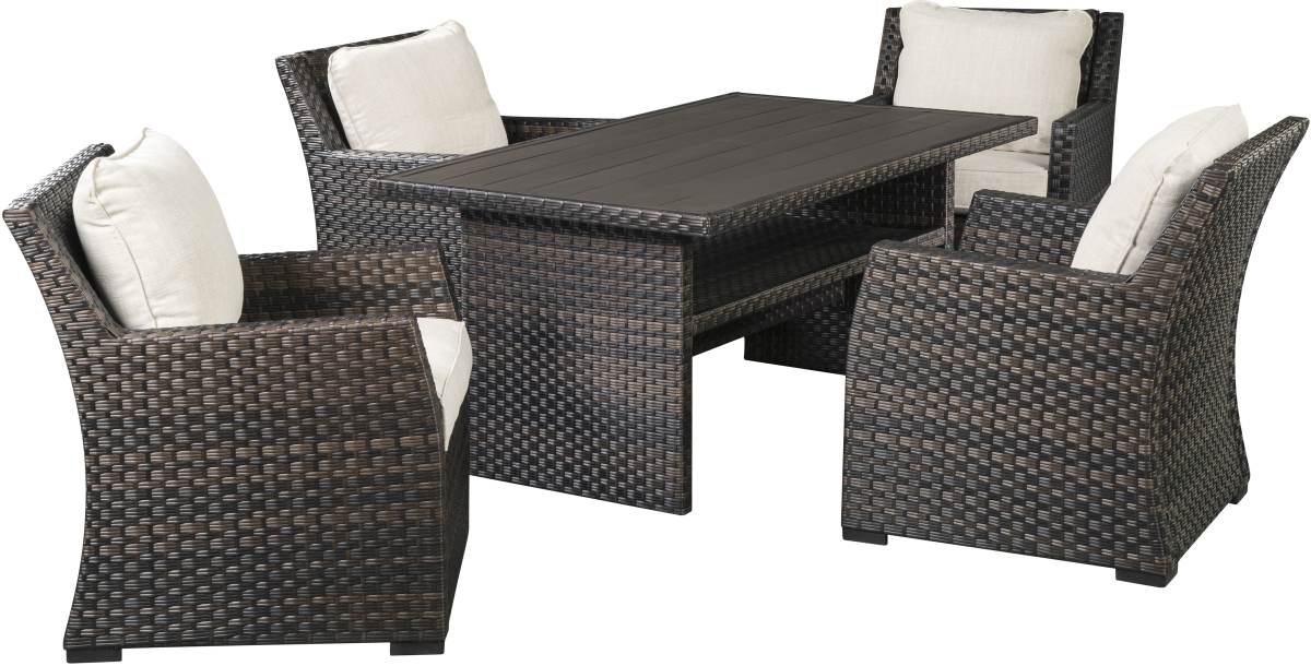 Includes outdoor table and 4 lounge chairs with cushions