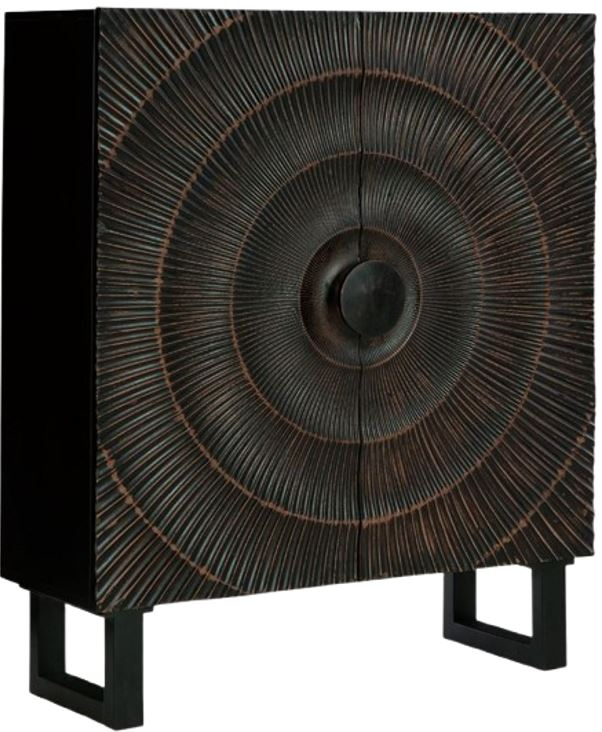 High style is on the rise with this wood accent cabinet. Its stunning doors, graced with a carved sunburst pattern and oversized wood pull, open to reveal two shelves. A distressed black finish adds contemporary flair. Whether this cabinet is accommodating storage needs or hiding clutter, it's truly a showpiece.Read More